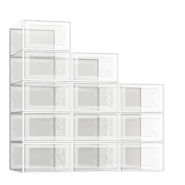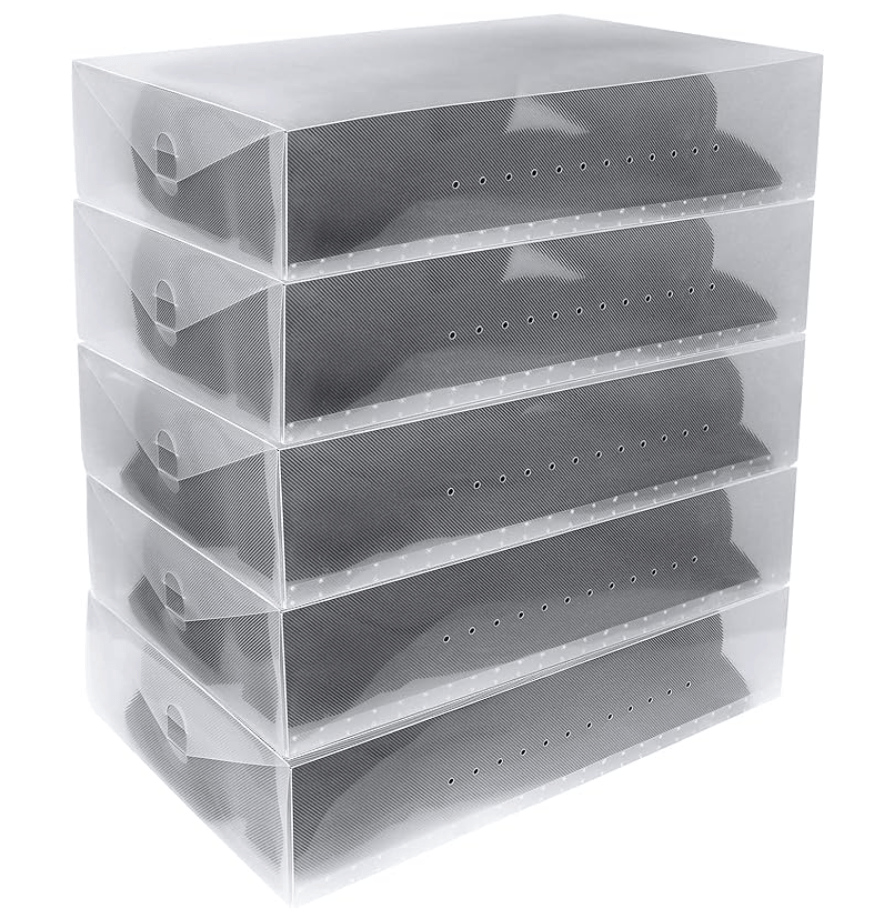 Here’s a gentle reminder: recycle those nice shoe boxes. These stackable shoe organizers save so much space in the closet. They are easy to assemble and a game-changer for closet organization.